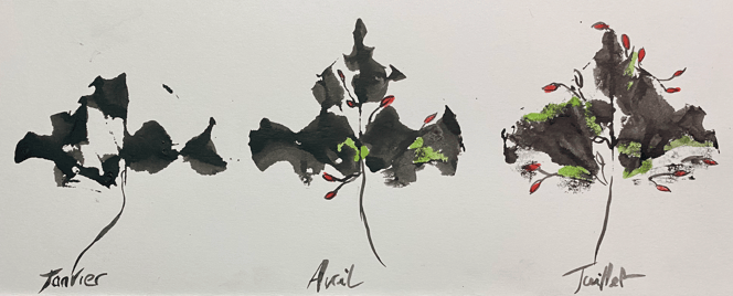 Et des calligraphies zen sur haïkus sont nées, les mots cherchant à révélant les secrets cachés dans la courbe des pétales ou la danse folle des herbes…Des haïkus et petits poèmes écrits tout au long du voyage, chacun sous un ciel différent, sur une île ou au pied d’un temple…
